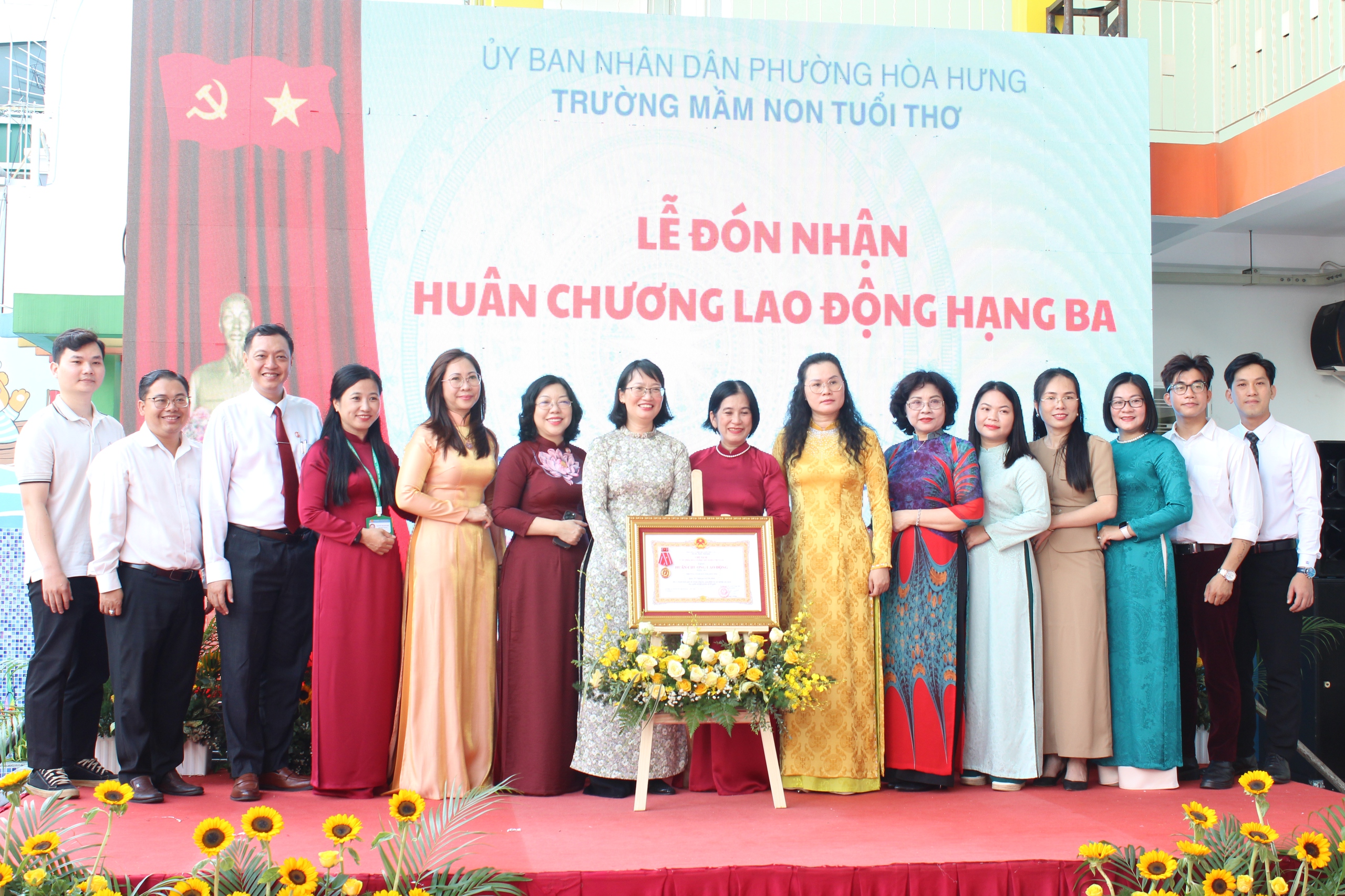 Lễ khai giảng và đón nhận Huân chương Lao động hạng ba tại Trường mầm non Tuổi Thơ sáng 5.9 có sự hiện diện của bà Trần Thị Diệu Thúy, Thành ủy viên, Phó chủ tịch UBND TP.HCM (thứ 7 từ trái qua); bà Lê Thụy Mỵ Châu, Phó giám đốc Sở GD-ĐT TP.HCM (thứ 9 từ trái qua) và nhiều vị đại biểu, khách quý