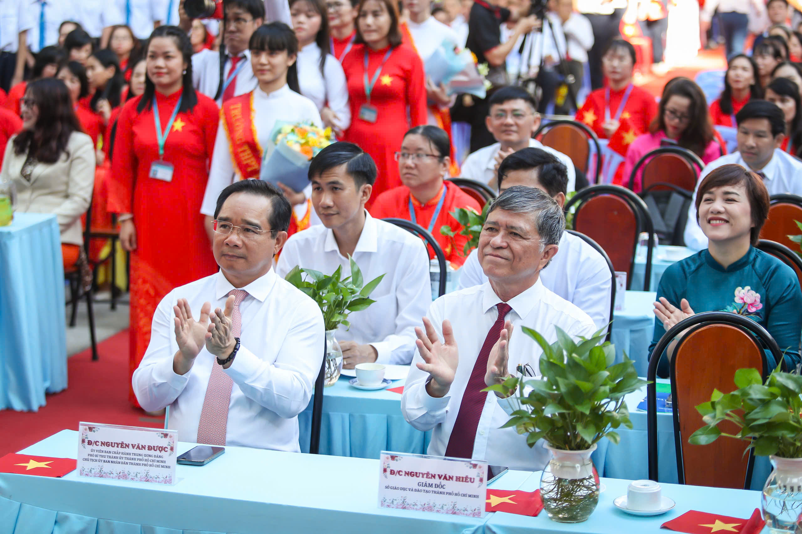 Ông Nguyễn Văn Được (trái), Ủy viên Ban Chấp hành Trung ương Đảng, Phó bí thư Thành ủy, Chủ tịch UBND TP.HCM và ông Nguyễn Văn Hiếu, Giám đốc Sở GD-ĐT TP.HCM, chúc mừng thầy cô, các em học sinh Trường THPT Trần Phú
